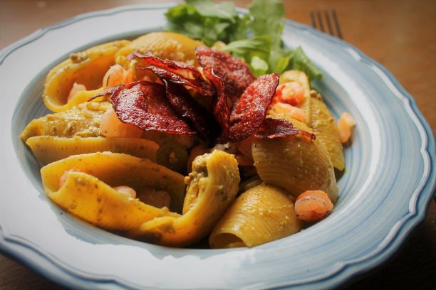 Makaron gotujemy al dente. Na oliwie smażymy krewetki, doprawiamy solą, pieprzem i czosnkiem. Na suchej patelni przygotowujemy salami. Wytapiamy nadmiar tłuszczu i sprawiamy, że staje się pyszny i chrupiący.